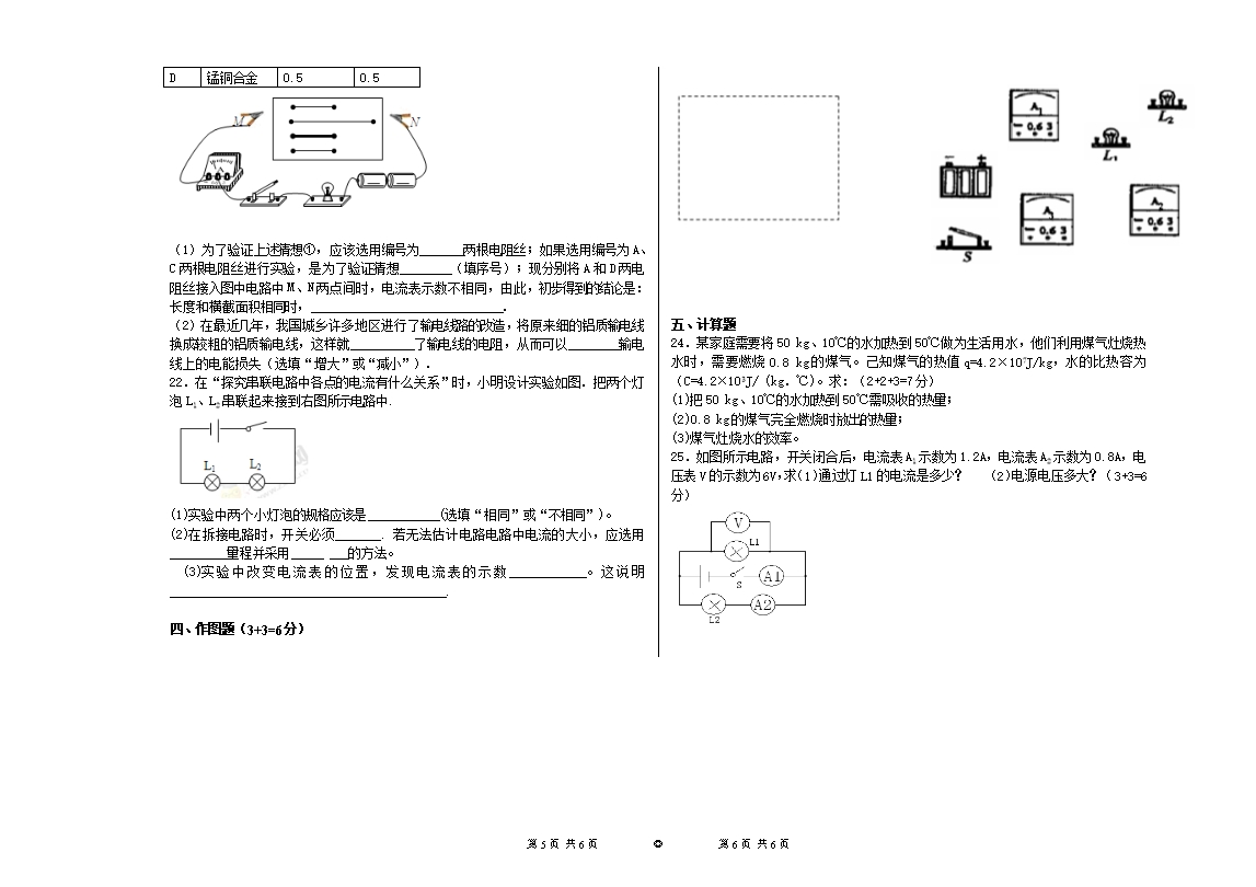 【内容简介】 一、选择题:(10*3=30分,请将答案填到下面的选项框内) 1.下列关于功、内能和热量的描述中不正确的是( ) A.物体的温度不变,内能一定不变 B.做功和热传递都能改变物体的内能 C.温度高的物体含有的热量比温度低的物体多 D.热量总是从内能大的物体向内能小的物体传递 2.如图是甲、乙两个相同质量的物体吸热后温度升高的情况,图中横坐标是物体温度的变化,纵坐标是物体吸收的热量.关于甲乙两种物质的比热容的大小下列判断正确的是(  ) A.c甲>c乙 B.c甲<c乙 C.c甲=c乙 D.无法判断 3.甲、乙两台热机,甲的效率比乙的低,其含义是( ) A.甲比乙做的有用功少 B.甲比乙消耗的燃料多 C.在做相同有用功的条件下,甲消耗的燃料多 D.在做相同有用功的条件下,甲损失的能量比乙少 4.关于电路的知识,下列说法中正确的是 A. 验电器的工作原理是异种电荷互相吸引 B.只要电路闭合,即使电路中没有电源,电路中也一定有电流 C.马路两旁的路灯,晚上同时亮早晨同时灭,它们是串联的 D. 楼道中的电灯是由声控开关和光控开关共同控制的,只有在天暗并且有声音时才能亮,所以声控开关、光控开关及灯是串联的 5.化纤布料的衣服容易沾上灰尘,是因为( )。 A.化纤衣服易潮湿从而沾上灰尘 B.化纤衣服有许多小孔,灰尘会钻进小孔不出来 C.化纤衣服质地柔软,灰尘喜欢躺在柔软的衣服里睡大觉 D.化纤衣服摩擦后容易起电,静电会吸引灰尘这类轻小物体 .......... ? ?