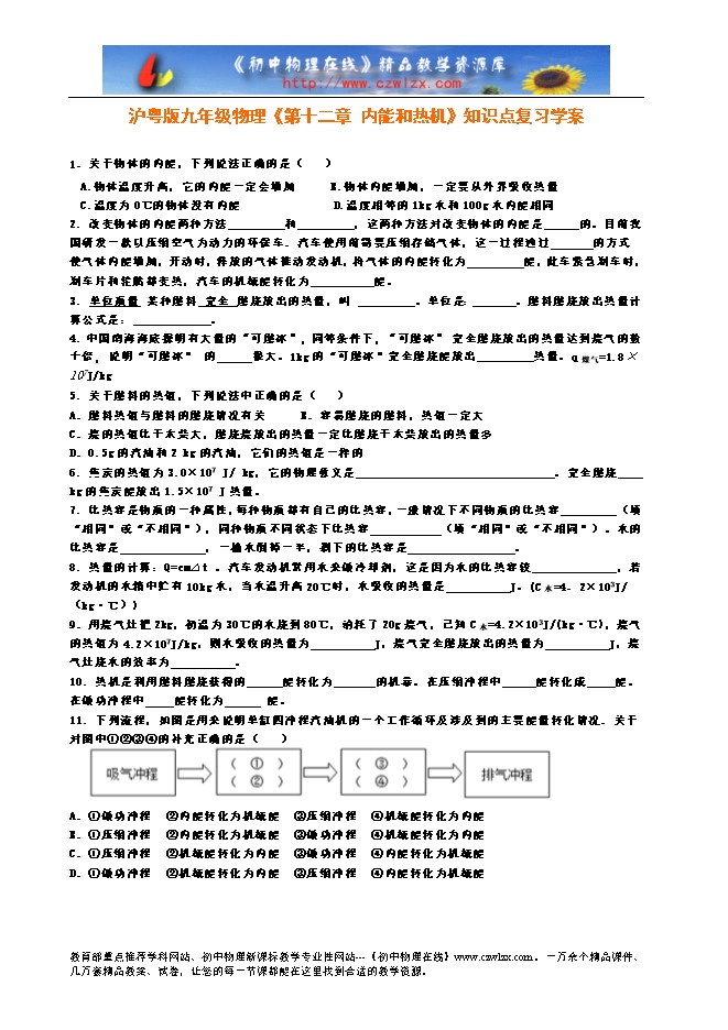 沪粤版九年级物理《第十二章 内能和热机》知识点复习学案