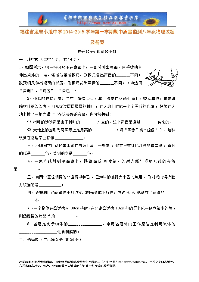 福建省龙岩小池中学2014-2015学年第一学期期中质量监测八年级物理试题及答案
