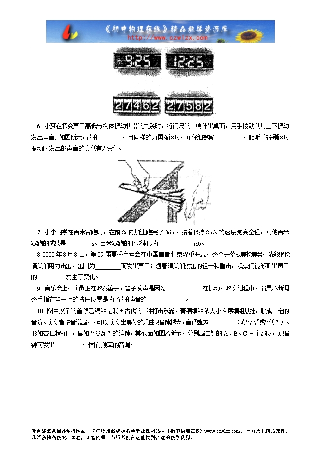 6. 小梦在探究声音高低与物体振动快慢的关系时,将钢尺的一端伸出桌面,用手拨动使其上下振动发出声音. 如图所示,改变________,用同样的力再拨钢尺,并仔细观察__________,倾听并辨别钢尺振动时发出的声音的高低有无变化。
