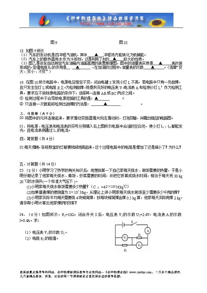 - 2185山东省曹县2014-2015学年度第一学期期中考试九年级物理试题(教科版,附答案)