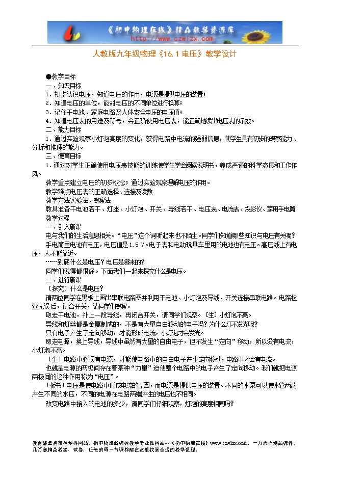 教学重点建立电压的初步概念;通过实验观察理解电压的作用。