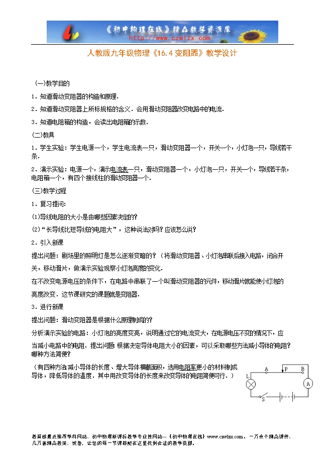 - 上一份资料:人教版九年级物理《16.3电阻》教学设计
