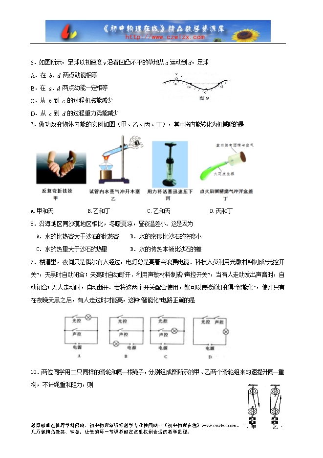 6.如图所示,足球以初速度v沿着凹凸不平的草地从a运动到d,足球