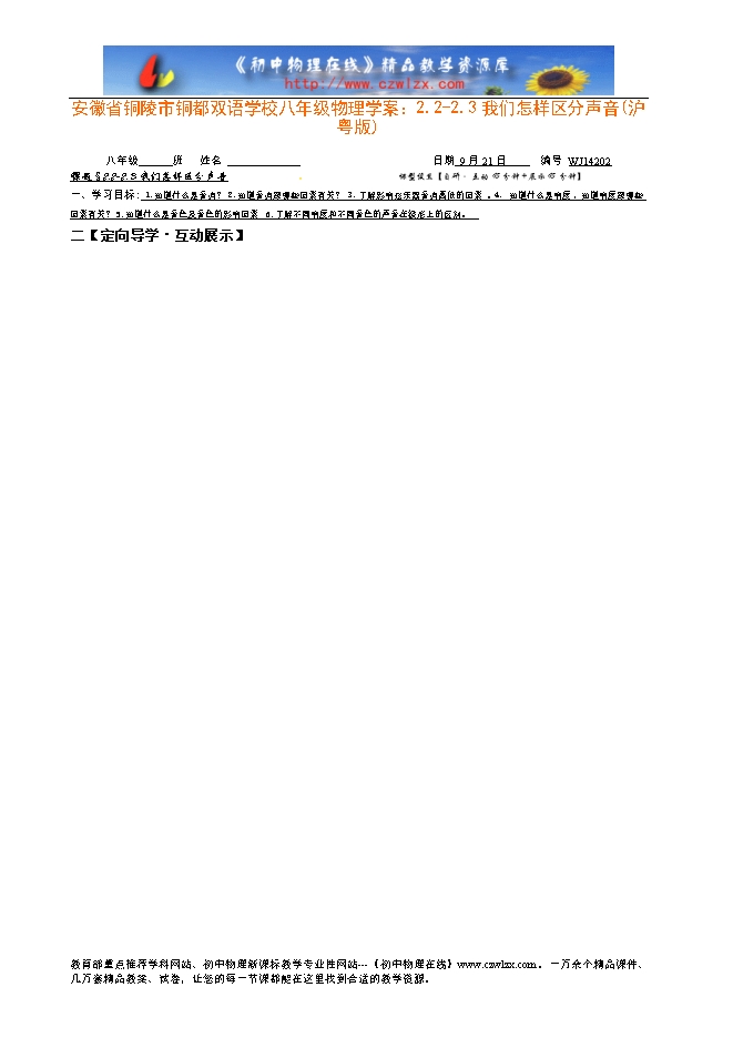 安徽省铜陵市铜都双语学校八年级物理学案:2.2-2.3我们怎样区分声音(沪粤版)