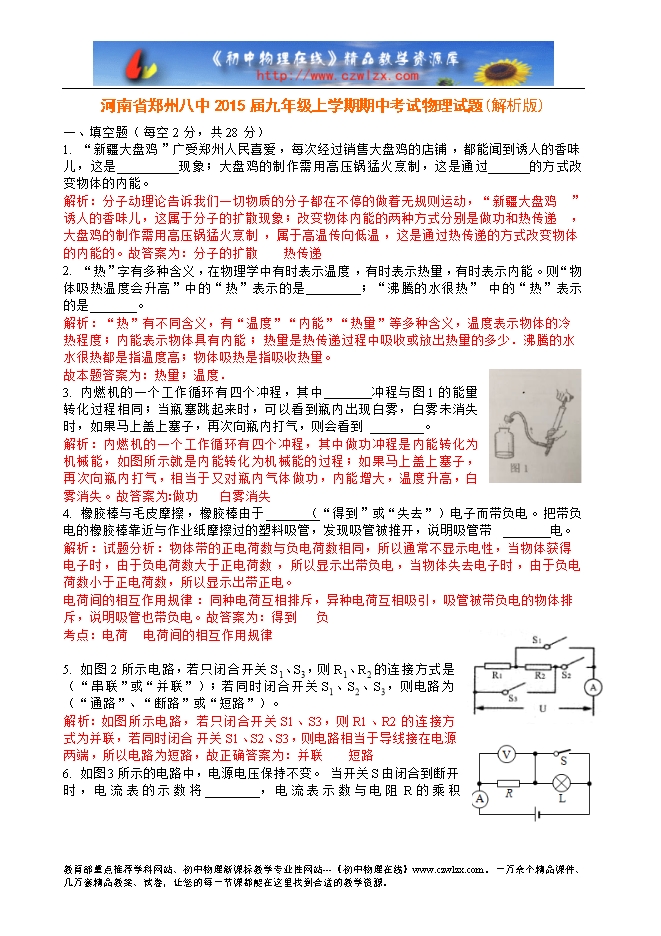 河南省郑州八中2015届九年级上学期期中考试物理试题(解析版)