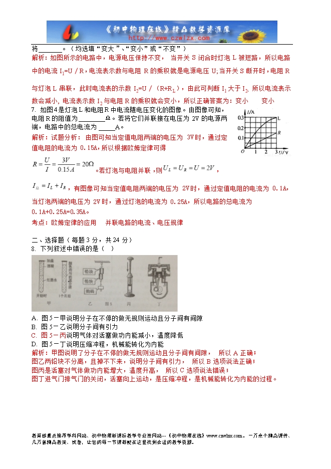 解析:内燃机的一个工作循环有四个冲程,其中做功冲程是内能转化为机械能,如图所示就是内能转化为机械能的过程;如果马上盖上塞子,再次向瓶内打气,相当于又对瓶内气体做功,内能增大,温度升高,白雾消失。故答案为:做功 白雾消失