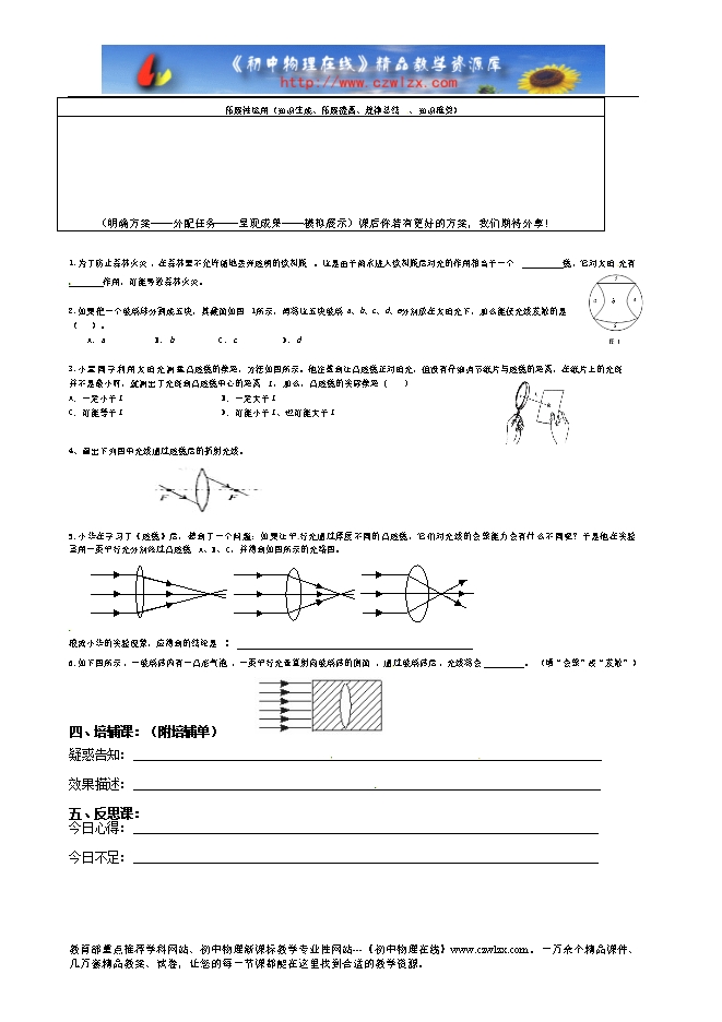 学法指导:1.我们知道光在传播过程中会发生折射现象,观察课本P66图3-49,并观察教师演示实验,用一束平行光分别照射到凸透镜和凹透镜上,观察这两种透镜对光的折射有什么不同?(注意观察光斑大小和 光斑亮度的变化)结合课本归纳凸透镜、凹透镜对光有什么作用。