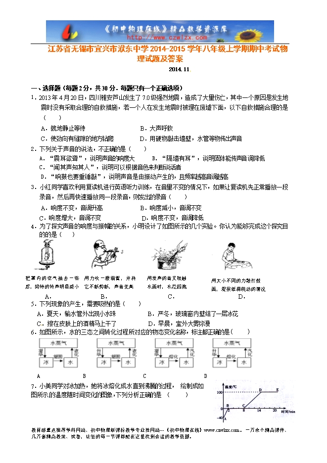 江苏省无锡市宜兴市洑东中学2014-2015学年八年级上学期期中考试物理试题及答案