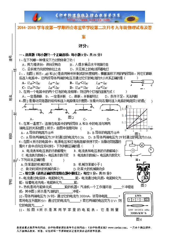 2014-2015学年度第一学期四会市星华学校第二次月考九年级物理试卷及答案