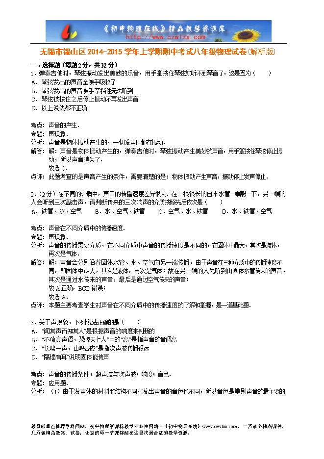 无锡市锡山区2014-2015学年上学期期中考试八年级物理试卷(解析版)
