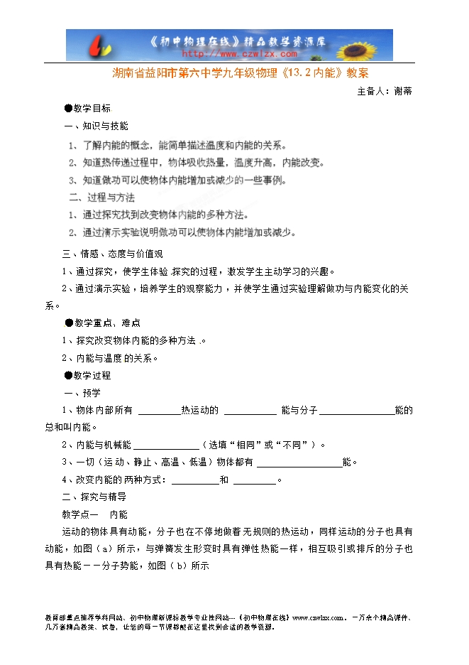 湖南省益阳市第六中学九年级物理《13.2内能》教案
