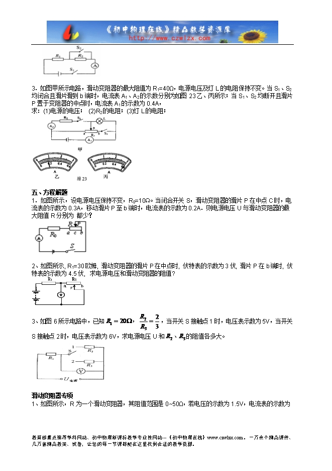 2.如图所示,滑动变阻器上标有“20Ω 2A”字样,当滑片P在中点时,电流表读数为0.24安,电压表读数为7.2伏,求: