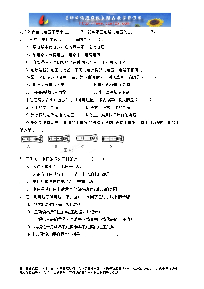 3、几种常见的电压值:一节干电池的电压是 V,家庭电路的电压是 V,对人体安全的电压是 V。