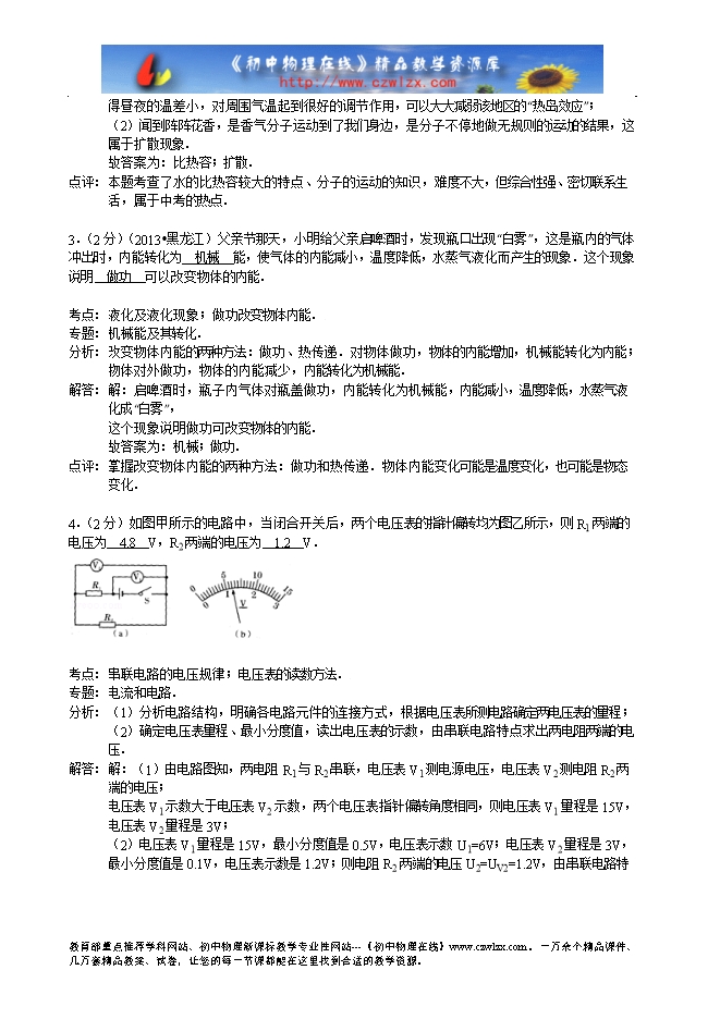 分析: (1)水的比热容较大,相同质量的水和其它物质比较,吸收或放出相同的热量,水的温度升高或降低的少,据此分析;