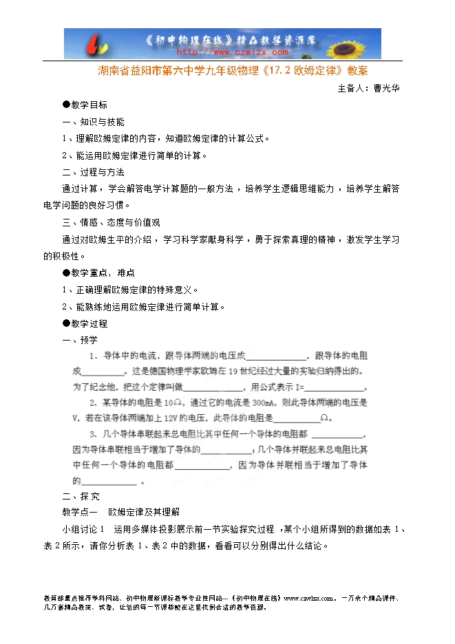 湖南省益阳市第六中学九年级物理《17.2欧姆定律》教案