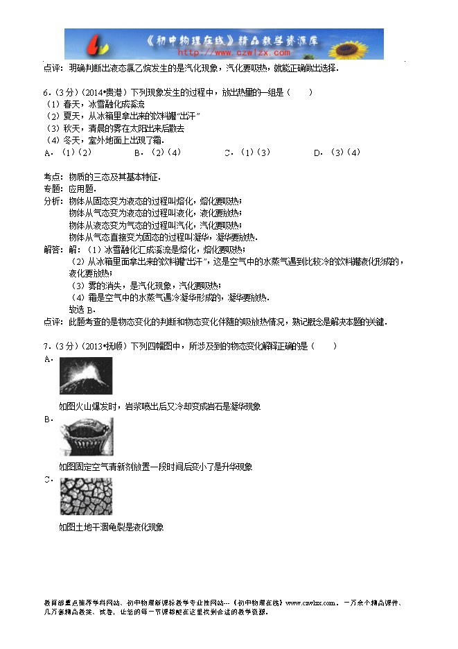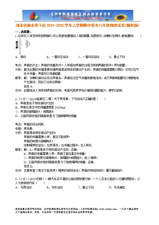 【内容简介】 一、选择题、 1.在探究人耳怎样听到声音时,可以用肥皂膜模拟人耳的鼓膜.如图所示,当喇叭发声时,肥皂膜将(  )   A. 振动 B. 一直向左运动 C. 一直向右运动 D. 静止不动 考点: 声音的产生;声音的传播条件;人耳感知声音的过程及听到声音的条件;声与能量.. 分析: 解决此题的关键是要知道声音是由物体的振动产生的,声音的传播是需要介质的,它可以在气体中传播,声音可以传递能量. 解答: 解:当喇叭振动会发出声音后,声音经过空气传播到肥皂泡处,由于声音有能量可以使肥皂泡产生振动,因此又会发出声音; 故选A. 点评: 此题结合人耳听到声音的实例,考查利用声学知识解释问题的能力,要学以致用.   2.(3分)(2014?盐都区二模)关于声现象,下列说法不正确的是(  )   A. 声音是由于物体振动产生的   B. 声音在真空中的传播速度是3×108m/s   C. 声源的振幅越大,响度越大   D. 公路两旁安装的隔音板是为了阻断噪声的传播 考点: 声音的综合利用.. 专题: 声现象. 分析: 声音是由物体振动产生的; 声音的传播需要介质,真空不能传声; 声音的响度与振幅有关; 控制噪声的途径:在声源处,在传播过程中,在人耳处. 解答: 解:A、声音是由于物体振动产生的,正确; B、声音的传播需要介质,声音不能在真空中传播; C、声音的响度与振幅有关,振幅越大响度越大,故C错误; D、公路两旁安装的隔音板是为了阻断噪声的传播,正确. 故选B. 点评: 本题考查了真空不能传声;噪声的减弱途径;声音的特性的知识,属于基础知识. ........ ?