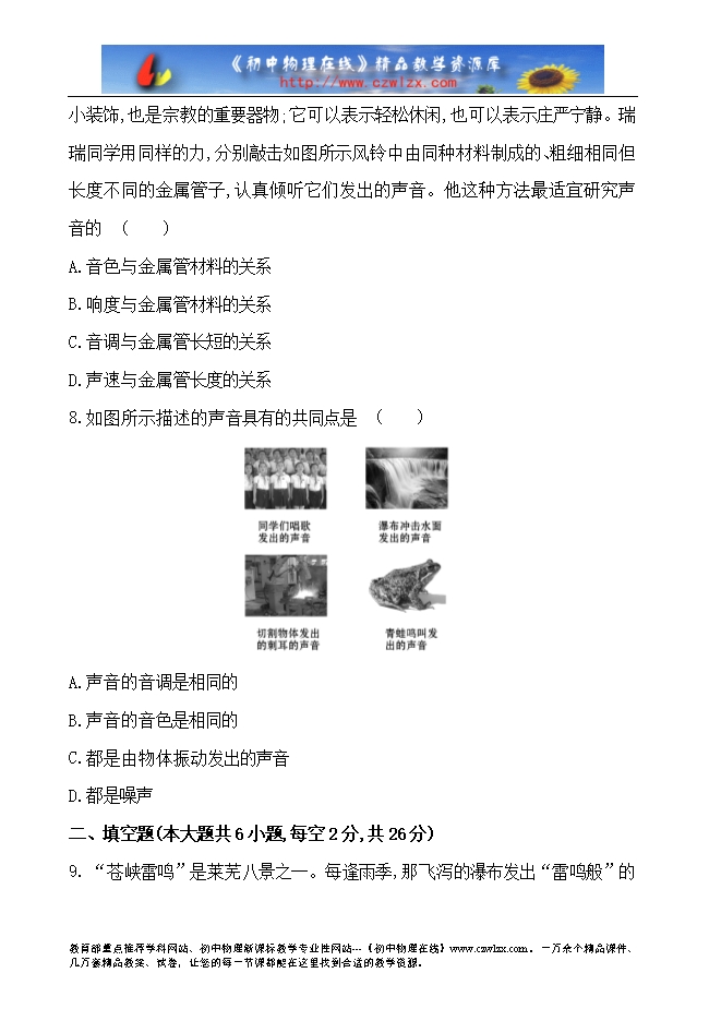 5.如图所示,在两个完全相同的高脚玻 璃杯内装有相同深度的水,当用筷子轻轻敲击杯子时,两个杯子就会发出相同的声音。那么下列说法中正确的是 ( )