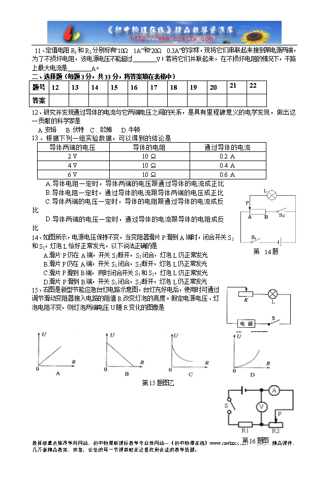 4、一个电阻,在它两端加10V的电压时,通过的电流为0.5A,则该电阻的阻值是 Ω;如果电阻两端电压变为5V,该电阻的阻值是 Ω。