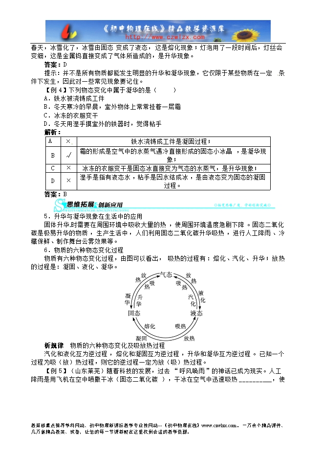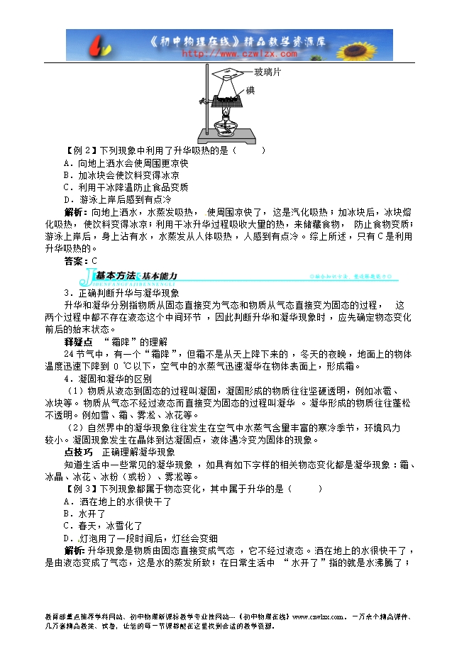 举例 放在衣橱里的樟脑 球变小了;用久了的灯泡钨丝变细了 冬天玻璃上的窗花、美丽的雾凇、霜 等