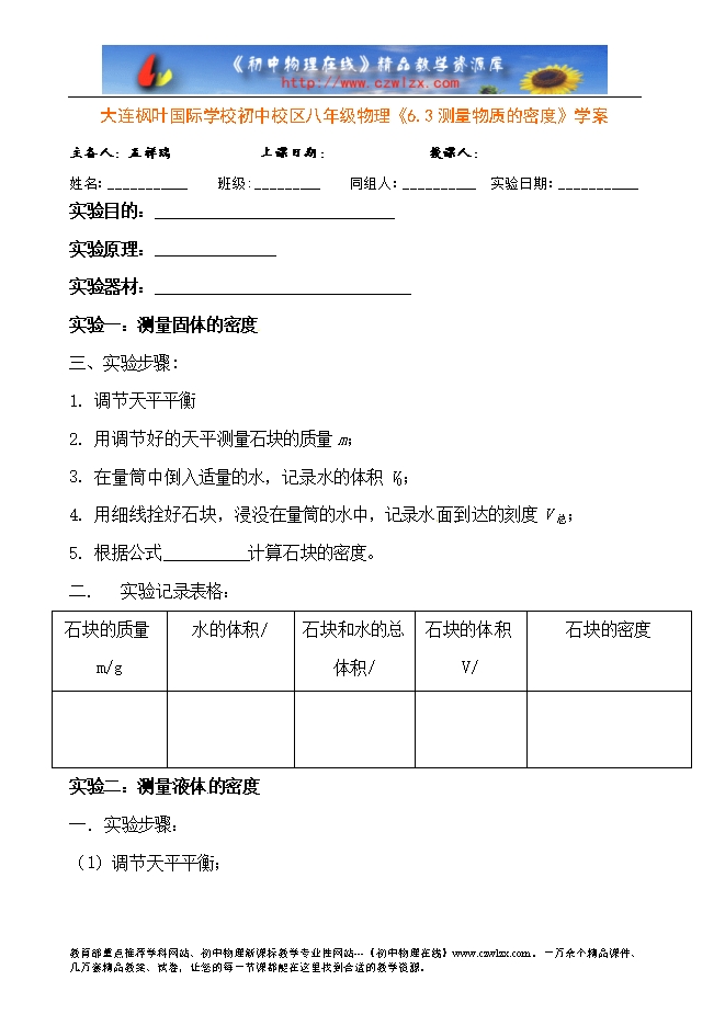 大连枫叶国际学校初中校区八年级物理《6.3测量物质的密度》学案