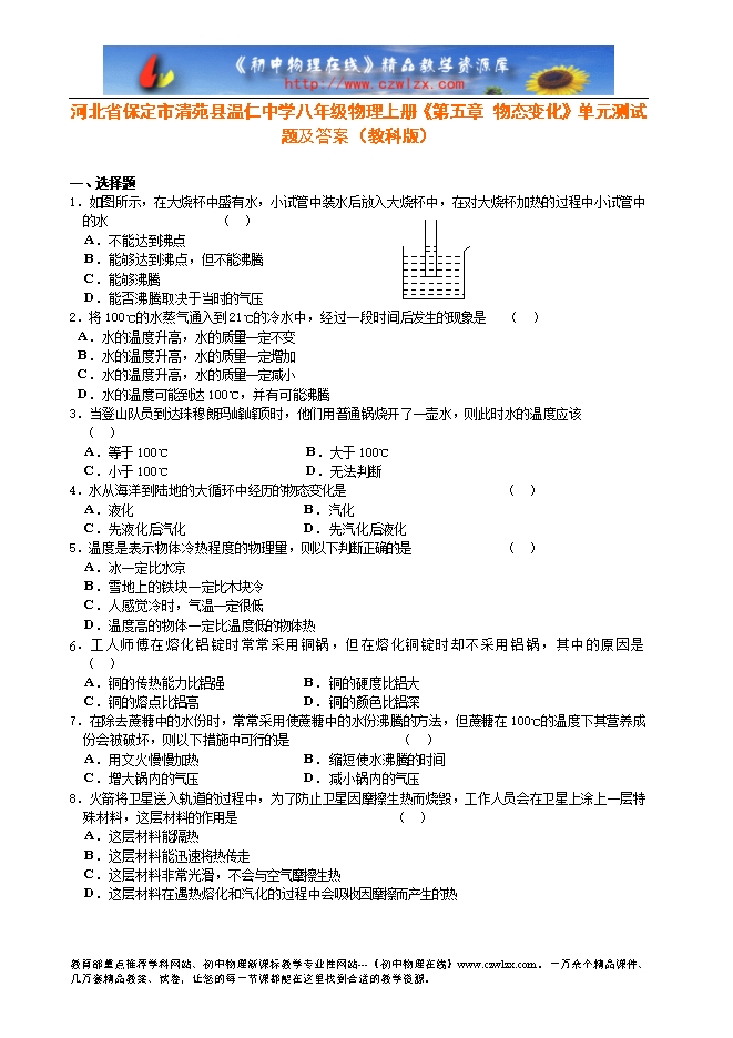 河北省保定市清苑县温仁中学八年级物理上册《第五章 物态变化》单元测试题及答案(教科版)