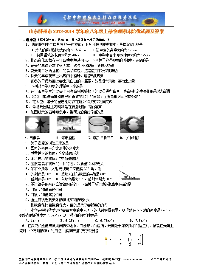 山东滕州市2013-2014学年度八年级上册物理期末陪优试题及答案