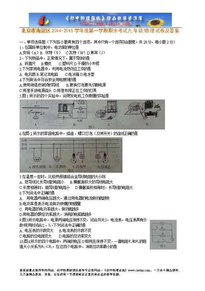 北京市海淀区2014-2015学年度第一学期期末考试九年级物理试卷及答案