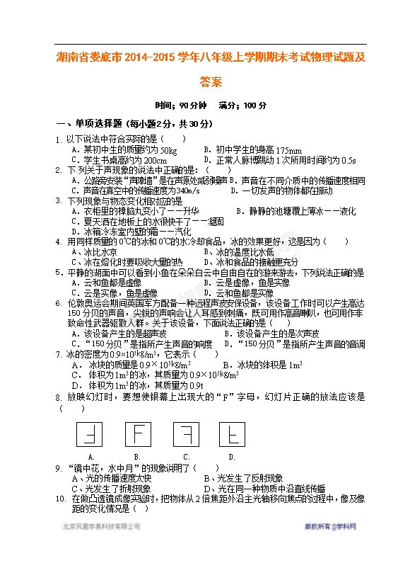 湖南省娄底市2014-2015学年八年级上学期期末考试物理试题及答案