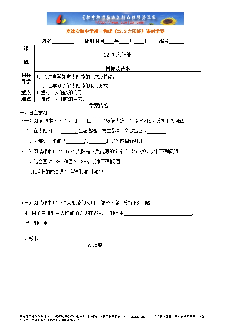 夏津实验中学初三物理《22.3太阳能》课时学案