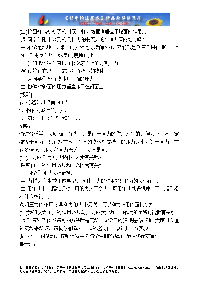 对于压强的概念的引入采用教师启发式教学;对于压强的影响因素和定义采用探究式教学;对于压强的计算采用讲授法及讲练结合的方法;对于增大和减小压强采用自主学习的方式。
