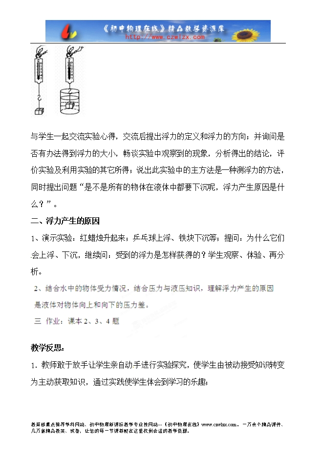 过程与方法:①通过观察,认 识浮力的存在,学会用弹簧秤测量浮力。