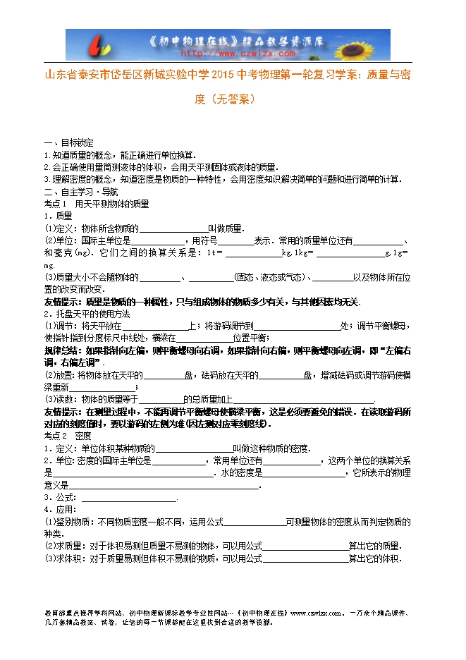 山东省泰安市岱岳区新城实验中学2015中考物理第一轮复习学案:质量与密度(无答案)