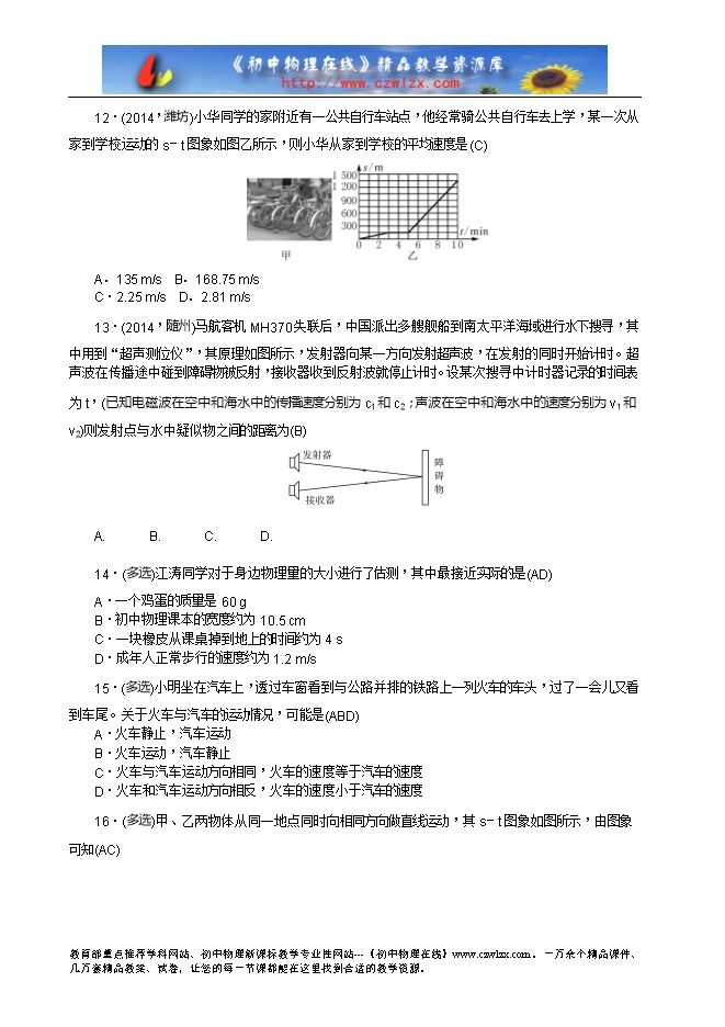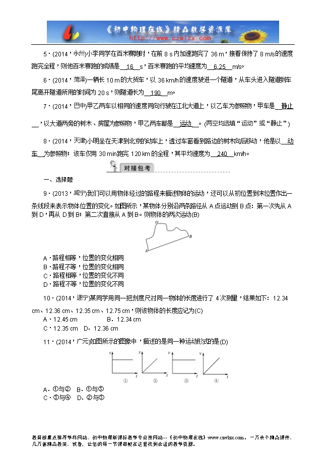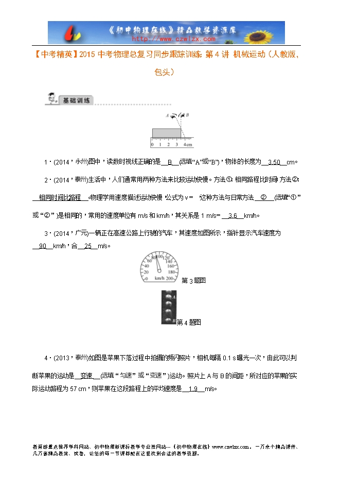 【中考精英】2015中考物理总复习同步跟踪训练:第4讲 机械运动(人教版,包头)