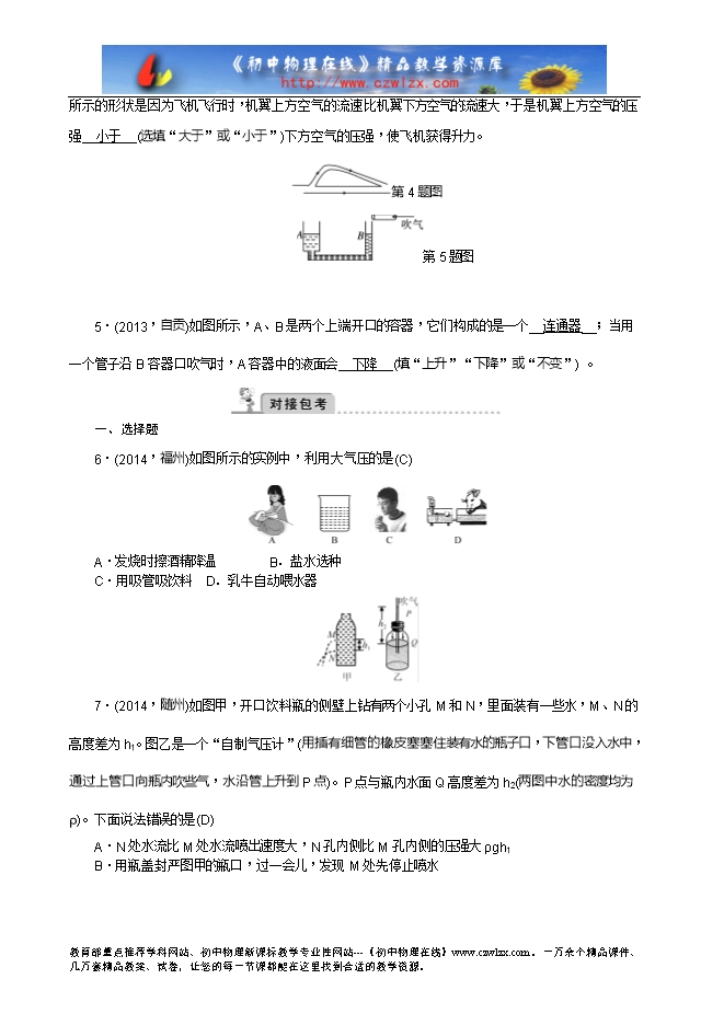 4.(2014,泸州)“歼20”是我国新研制的隐形战机,它的“隐身”原理主要是机身对雷达发射的__电磁波__(选填“超声波”“声波”或“电磁波”)具有良好的吸收作用。机翼的横截面设计为如图所示的形状是因为飞机飞行时,机翼上方空气的流速比机翼下方空气的流速大,于是机翼上方空气的压强__小于__(选填“大于”或“小于”)下方空气的压强,使飞机获得升力。
