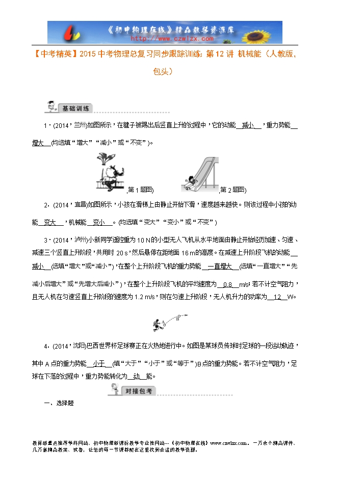 【中考精英】2015中考物理总复习同步跟踪训练:第12讲 机械能(人教版,包头)