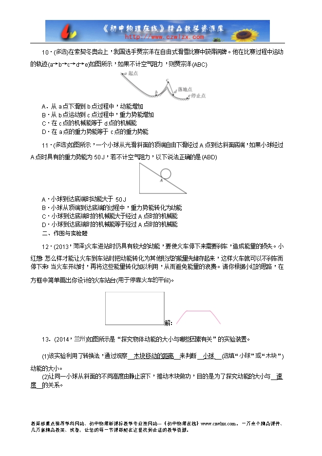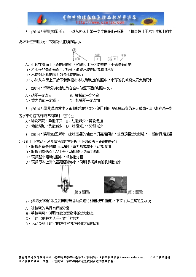 【内容简介】1.(2014,兰州)如图所示,在毽子被踢出后竖直上升的过程中,它的动能__减小__,重力势能__增大__(均选填“增大”“减小”或“不变”)。