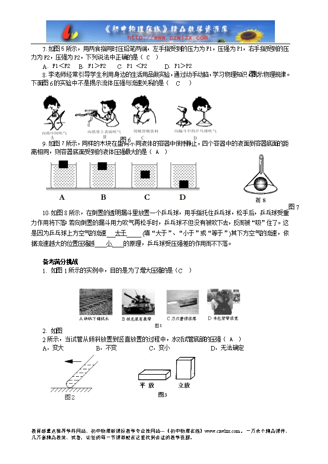 5.减小压强的三种方法:(1)当压力F一定时,需增大受力面积S;(2)当受力面积S一定时,需减小压力F;(3)在条件允许的情况下,可以同时增大受力面积S,减小压力F。