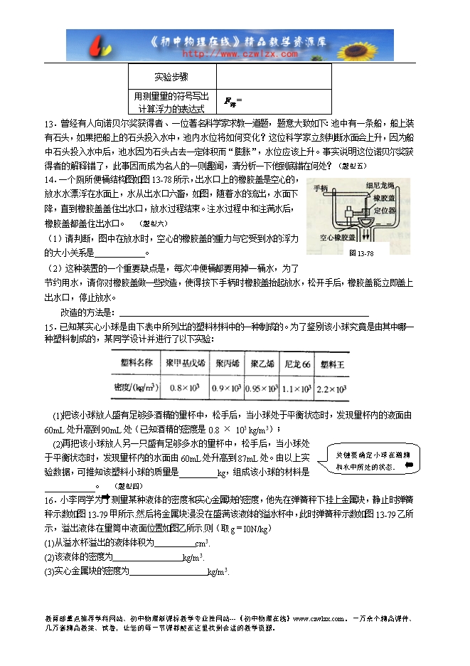 6.如图13-74所示,研究浮力与排开液体的体积有关的实验装置是下图中的( )(题型一)