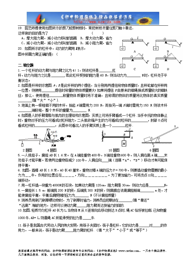 6. 如图所示杠杆,力F方向始终竖直向上,当此杠杆在动力F作用下,将一个由细绳系的物体由图中位置逆时针匀速转动到水平位置时,则 ( )