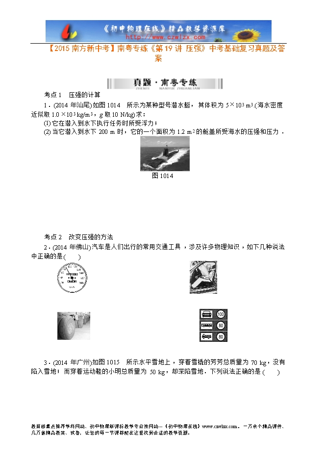 【2015南方新中考】南粤专练《第19讲 压强》中考基础复习真题及答案