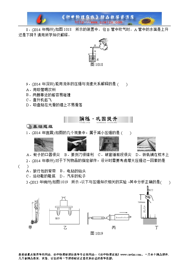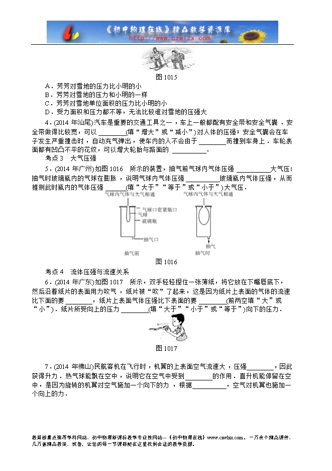 3.(2014年广州)如图10-1-5所示水平雪地上,穿着雪橇的芳芳总质量为70 kg,没有陷入雪地;而穿着运动鞋的小明总质量为50 kg,却深陷雪地.下列说法正确的是( )