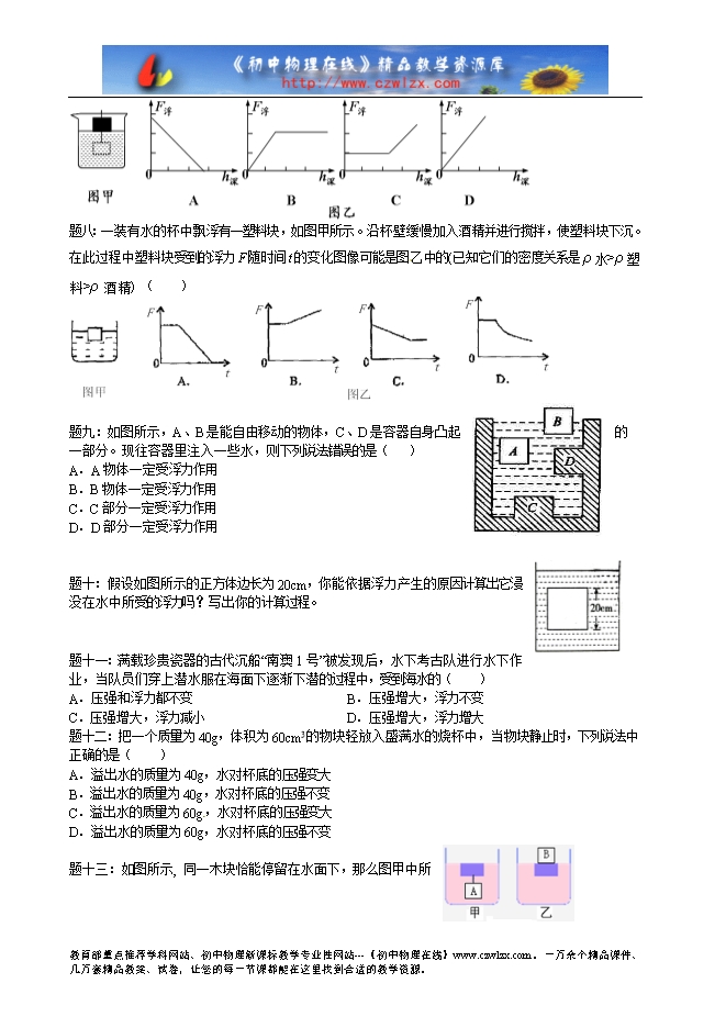 【内容简介】题一:将空矿泉水瓶慢慢压入水中,直到完全浸没。下列对矿泉水瓶受到的浮力分析不正确的是( )