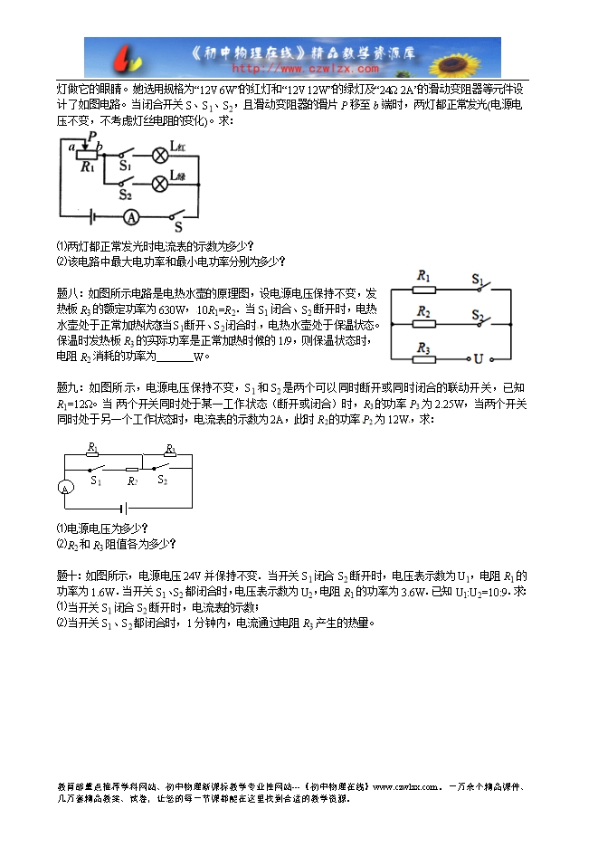 题二:在如图的电路中,灯泡L上标有“ 6V 4W”的字样,当S、S1均闭 合时,灯泡正常发光,电压表示 数为12V;若再断开S1,灯泡的实际功率变为原来的1/4,则下列选项正确的是( )