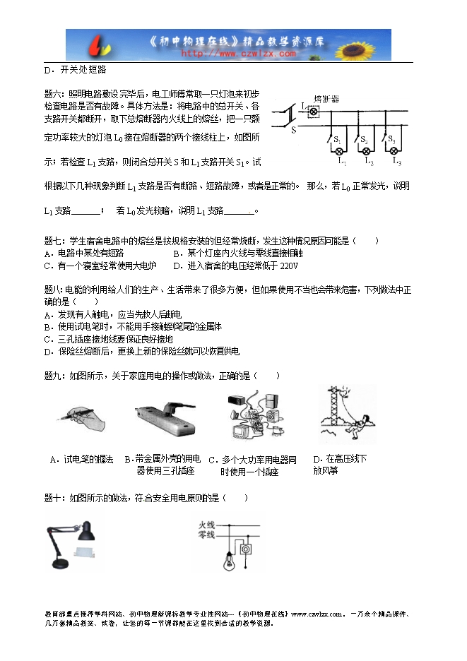 【内容简介】题一:下列三个现象: ①灯头里的两个线头相碰;② 插座中的两线头相碰;③ 照明电路的开关里两线头相碰。其中可能引起保险丝熔断的是( )
