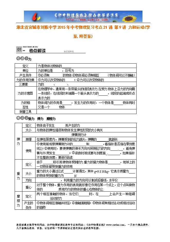 湖北省宜城市刘猴中学2015年中考物理复习考点21讲:第9讲 力和运动(学案,附答案)