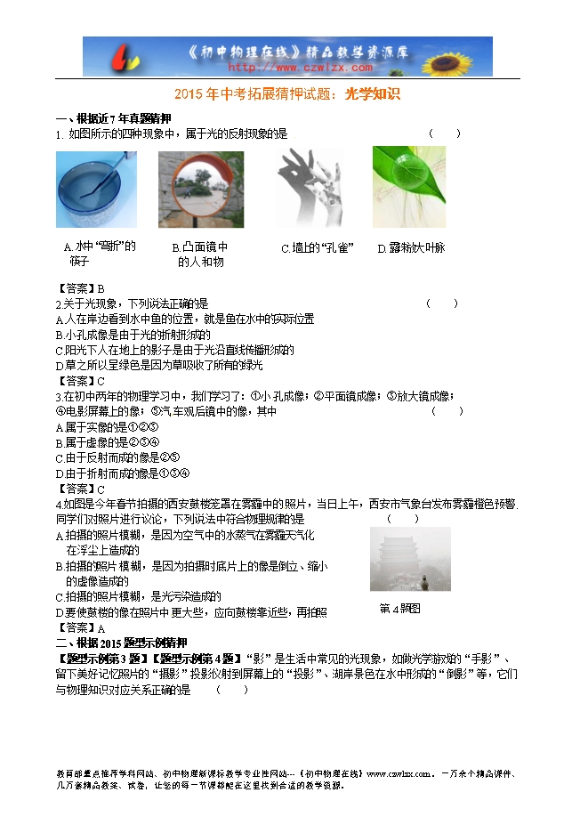 - 20172015年中考物理复习拓展猜押试题—光学知识