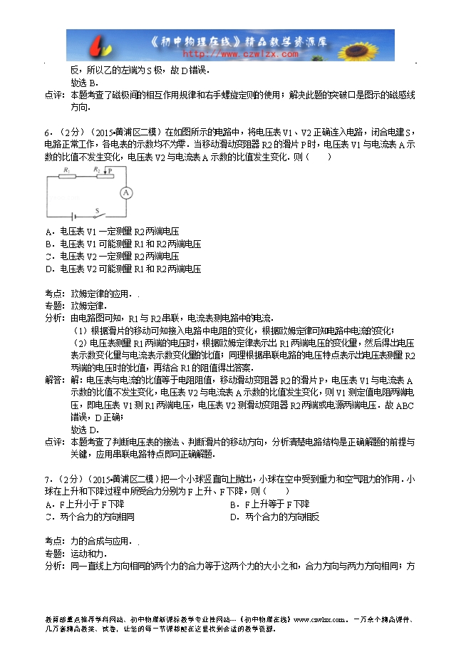 上海市黄浦区2015年中考物理二模试卷(word解析版)