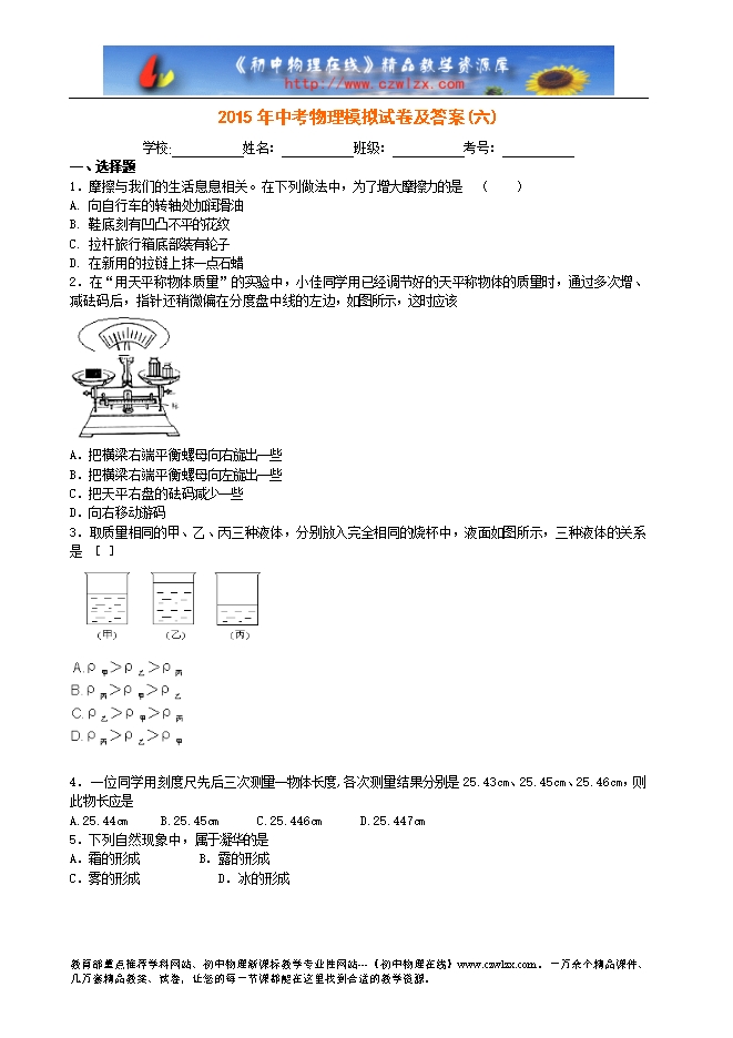2015年中考物理模拟试卷及答案(六)