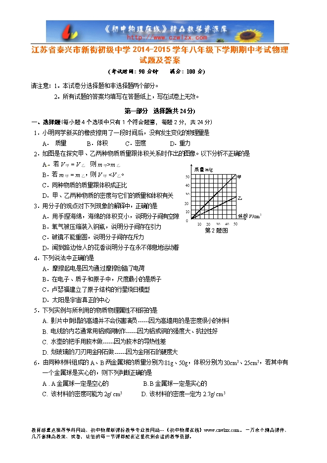 江苏省泰兴市新街初级中学2014-2015学年八年级下学期期中考试物理试题及答案